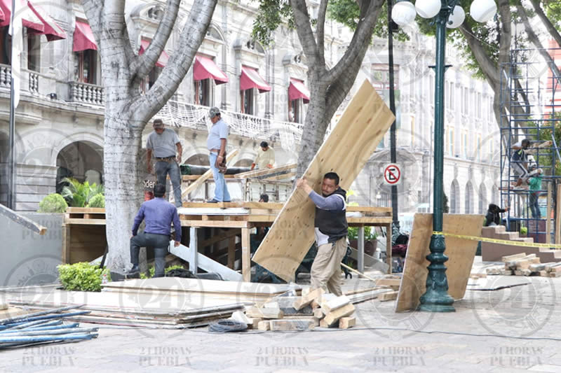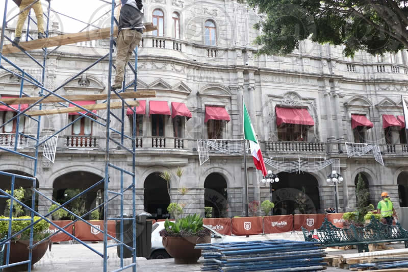 En el Zócalo de Puebla, desde esta mañana comenzaron a colocar la tarima para camarógrafos y fotógrafos que tomaran imagen del Grito de Independencia el próximo 15 de septiembre.