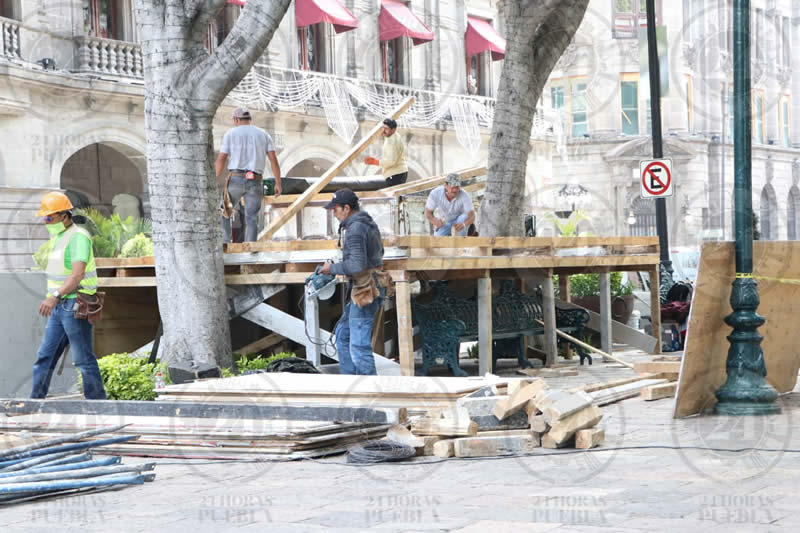 En un recorrido que hizo 24 Horas por el Zócalo poblano, se pudo observar a los trabajadores colocando la tarima para los periodistas, pues debido a la pandemia de coronavirus, este año la ceremonia se realizará sin público.