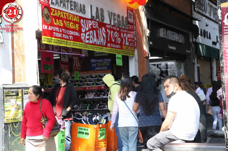 Locales de ropa, zapatería y otros en el Centro Histórico, tapizaron sus fachadas con letreros de ofertas para invitar a los poblanos a entrar y comprar.