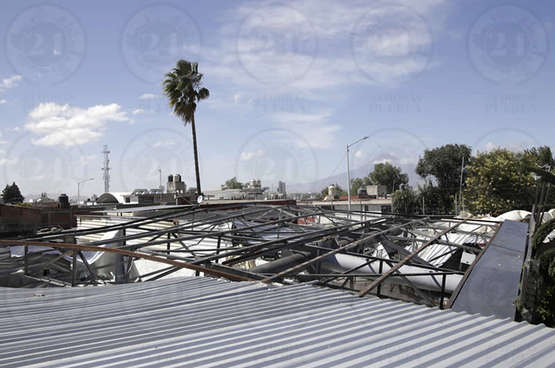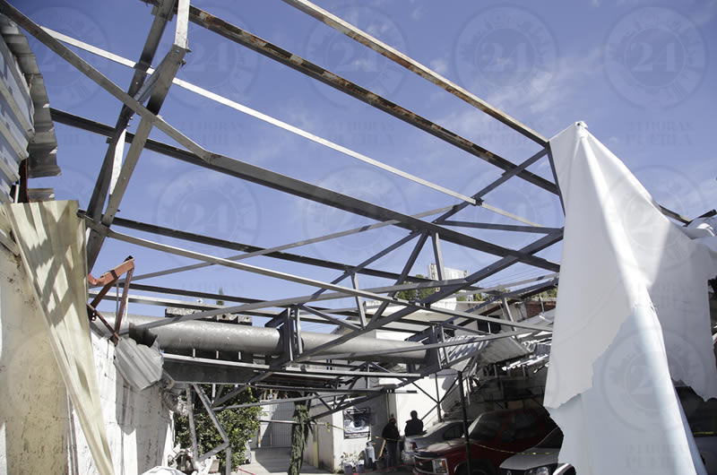 Los fuertes vientos que se registran este miércoles, provocaron que un anuncio espectacular cayera sobre una casa ubicada en la calle 53 Norte y el bulevar Hermanos Serdán.