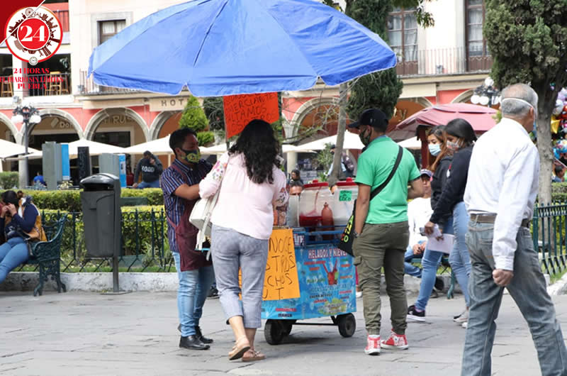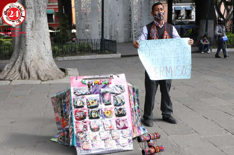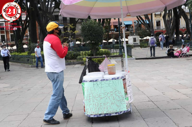 Este martes se plantaron en el Zócalo poblano con sus puestos de nieves, chicharrines, cubrebocas, muñecos y demás productos, manifestándose de esta forma y a su vez, aprovecharon para obtener ingresos.
