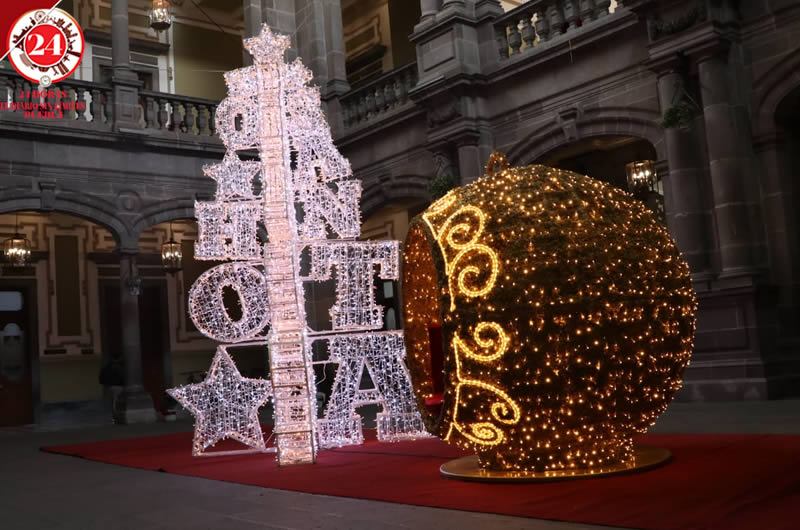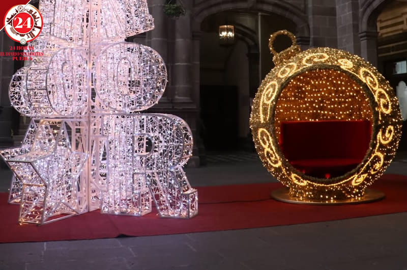 En el marco de las fiestas decembrinas, el Ayuntamiento de Puebla colocó un árbol navideño y una esfera gigante en el patio del Palacio Municipal, ubicado en el Centro Histórico.