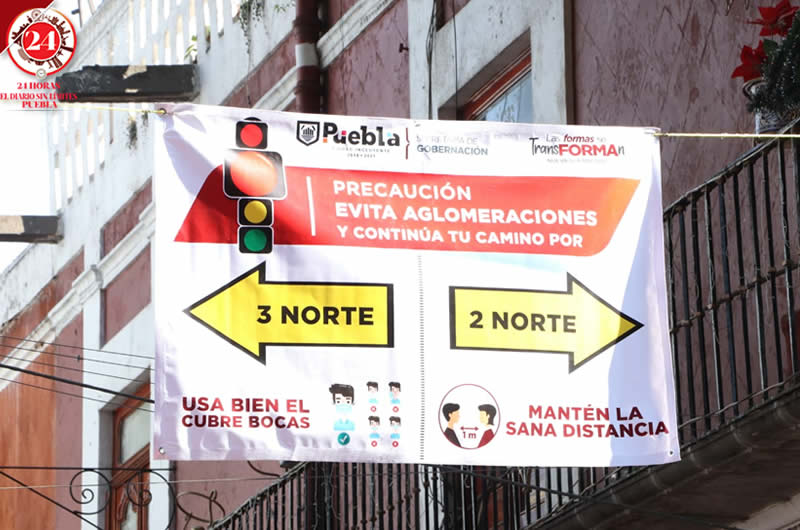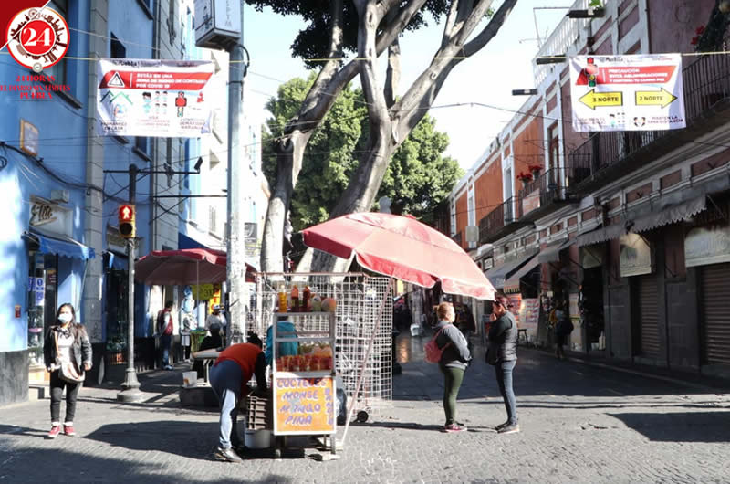 El Ayuntamiento de Puebla colocó lonas en la calle 5 de Mayo para advertir a la ciudadanía que esa parte del Centro es de alto riesgo de contagios.