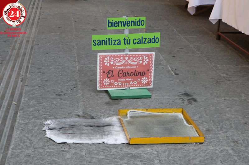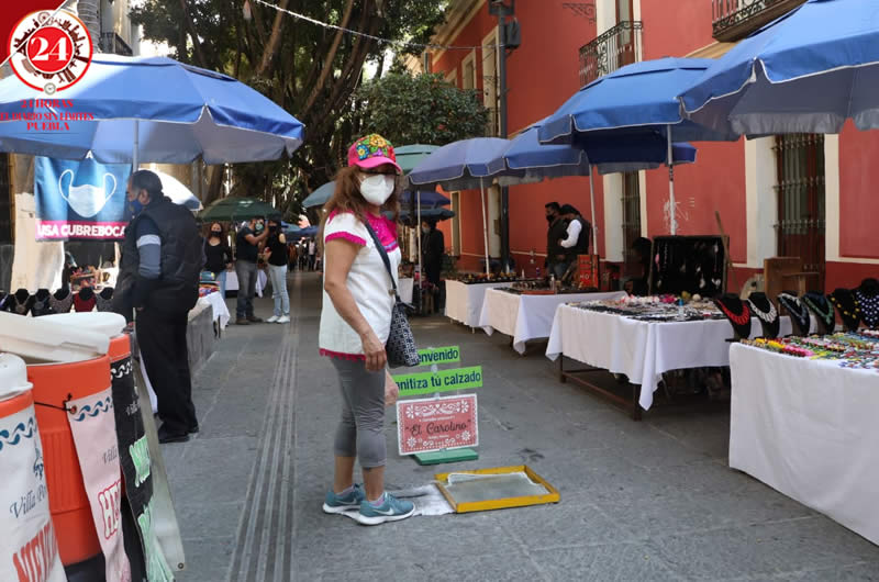 Desde el regreso a sus actividades a inicio de mes, esta zona de comercio en el Centro Histórico cuenta con señalética para exhortar a los poblanos al uso de cubrebocas en todo momento, de gel antibacterial y sanitizar el calzado.