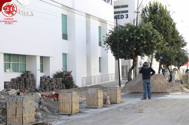 La 13 sur frente a Medicina de la BUAP está cerrada por los trabajos, en donde hay arena y tabiques apilados.