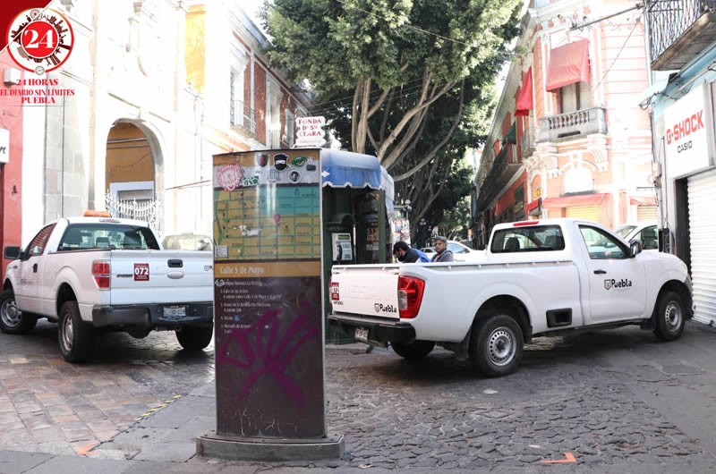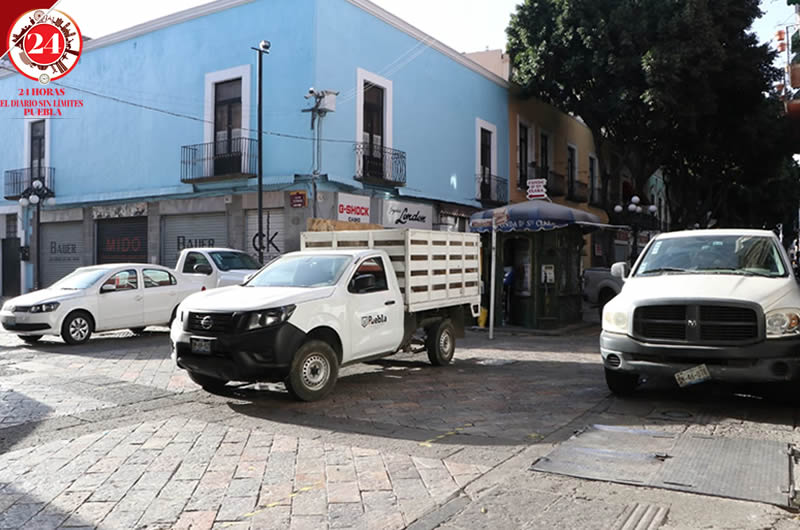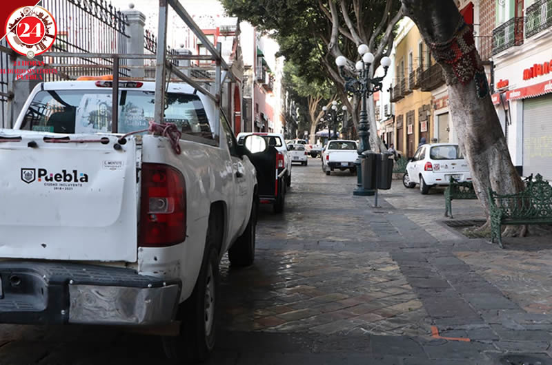 El Ayuntamiento de Puebla continúa estacionando vehículos oficiales en la calle 5 de Mayo, desde la calle 6 poniente hasta la 10, esto con la finalidad de evitar aglomeraciones y contagios de Covid-19; sin embargo, obstruyen el paso de los peatones.