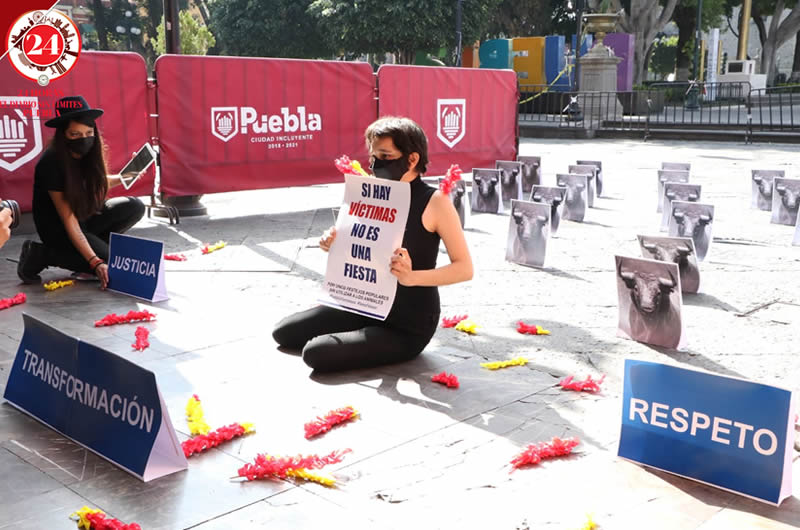 Un grupo de ciudadanos protestó a las puertas del palacio municipal en contra de la realización de las corridas de toros; dijeron respaldar la iniciativa de la alcaldesa Claudia Rivera Vivanco de prohibir la fiesta taurina en la capital poblana.