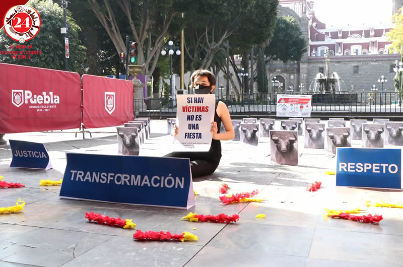 El movimiento #PueblaSinToros realiza un performance para promover su postura para que se prohíban las corridas de toros en la capital poblana.