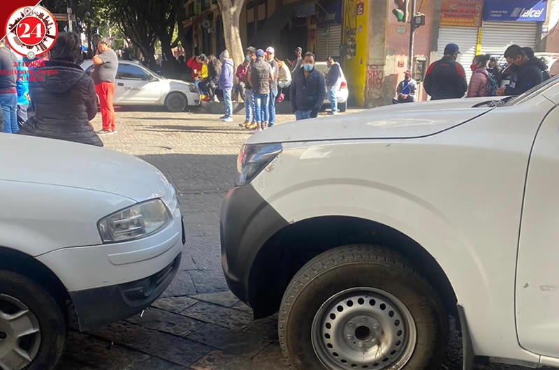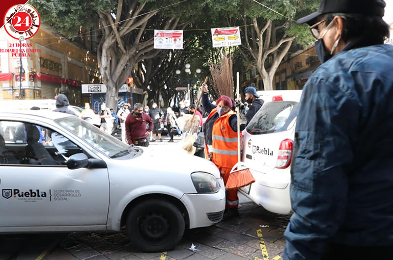 La calle 5 de Mayo y 8 Poniente lucen sin ambulantes, pero repletas de vehículos oficiales que bloquean el libre tránsito.