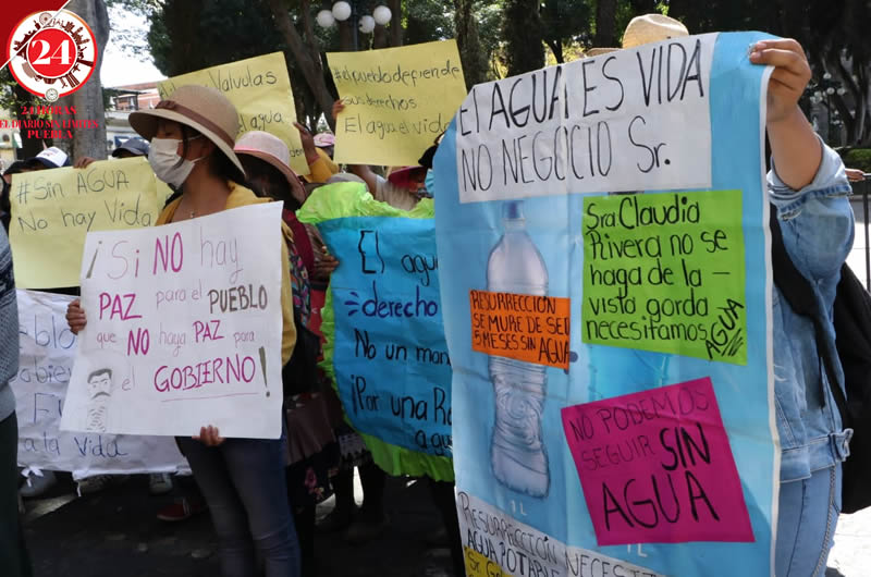 Vecinos de la junta auxiliar de La Resurrección se manifiestan frente al Palacio Municipal en exigencia que el ayuntamiento el problema de escasez de agua potable en la localidad.