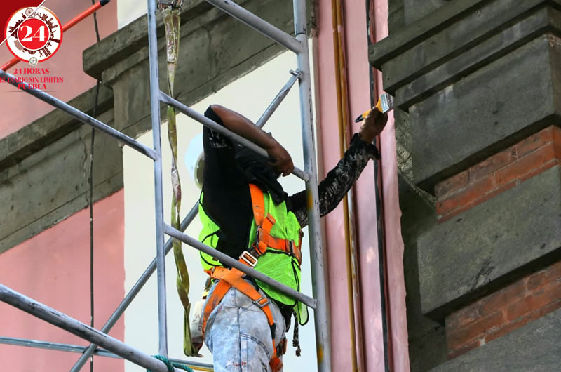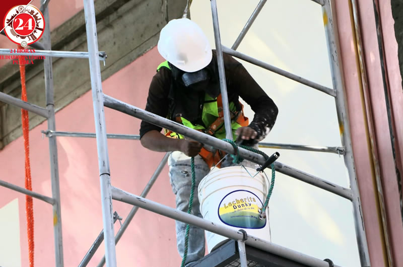 Los trabajadores se encuentran pintando este edificio en la zona comúnmente conocida como El Tercer Patio.