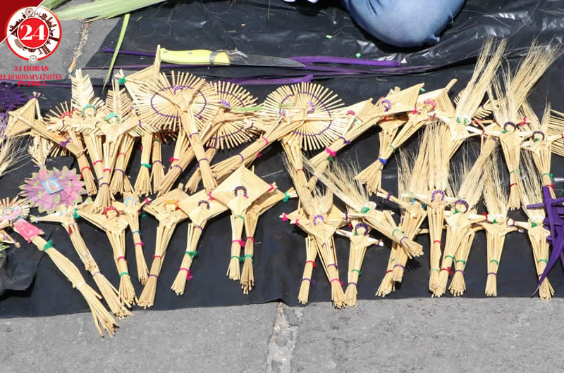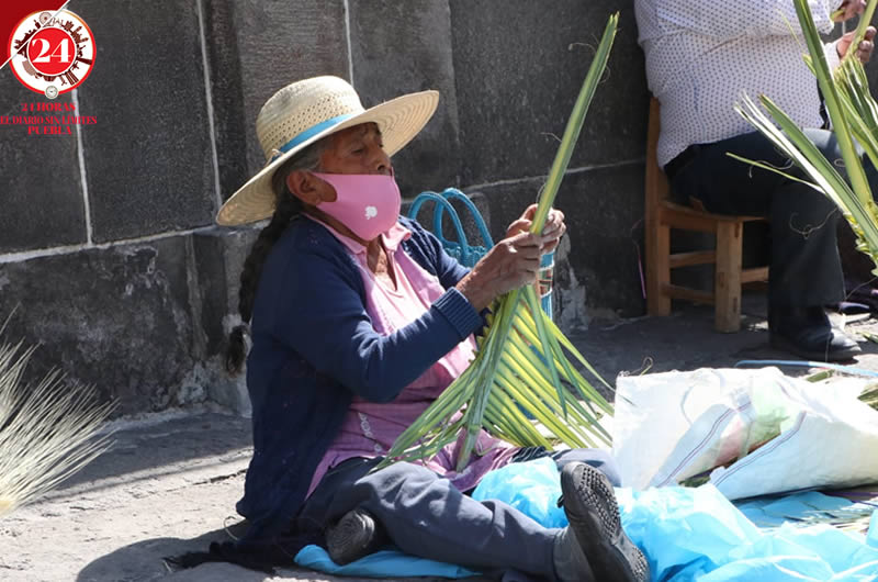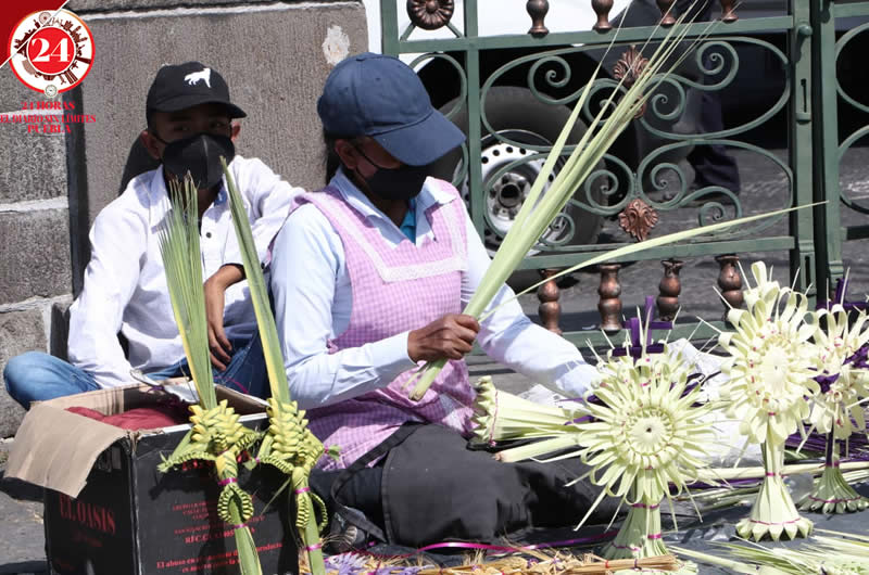 Artesanos que elaboran figuras de palma acudieron la tarde de este Domingo de Ramos a la Catedral de Puebla para ofrecer sus productos.
