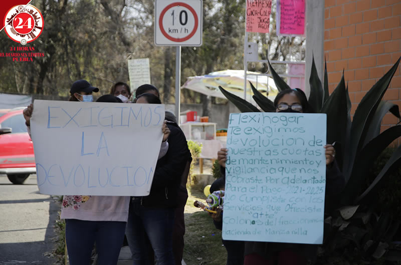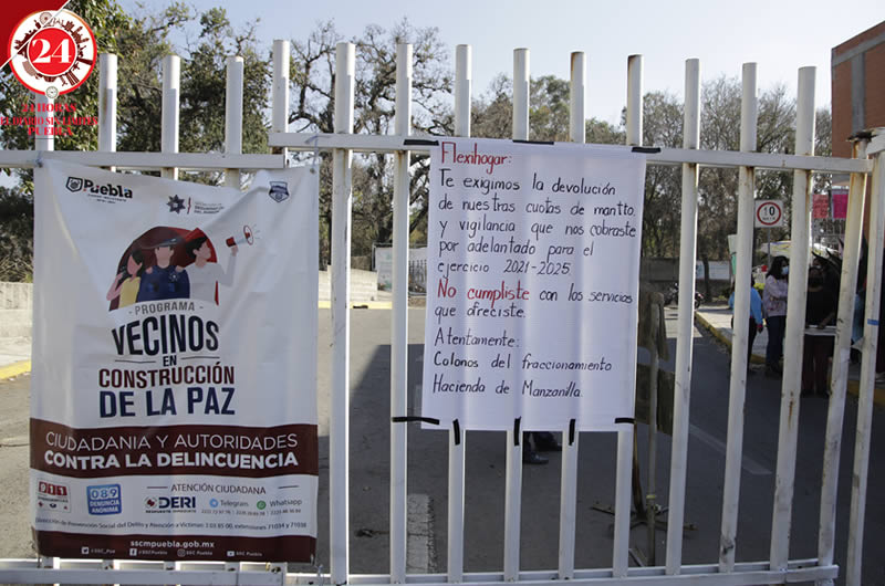 Vecinos del fraccionamiento Hacienda de Manzanilla se manifestaron por la falta de seguridad y acusaron a la constructora Flexihogar de cobrarles por este servicio sin que lo estén proporcionando.