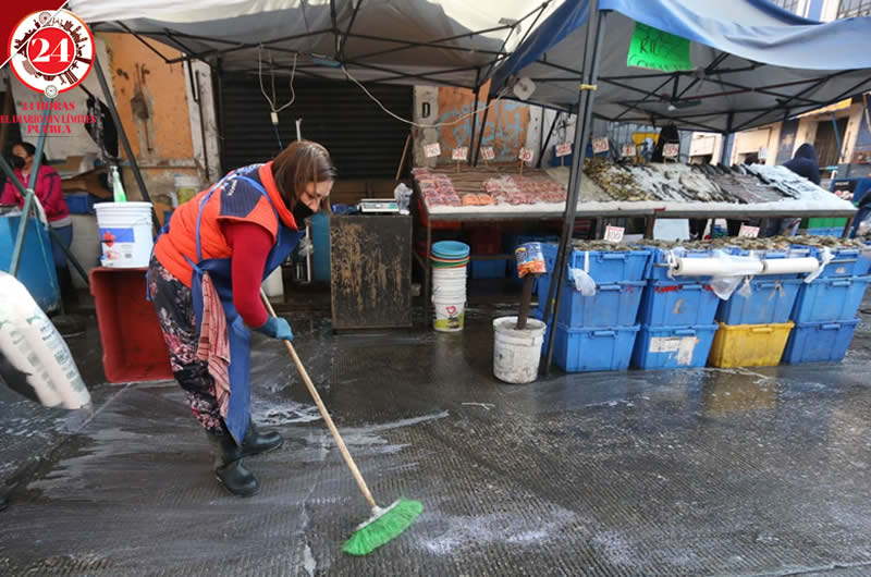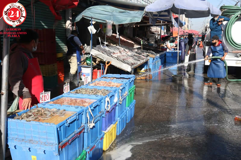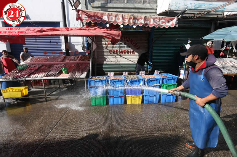 Los comerciantes del mercado 5 de Mayo limpiaron y lavaron el área de pescados y mariscos previo a la temporada de Semana Santa, la cual representa un repunte en sus ventas.