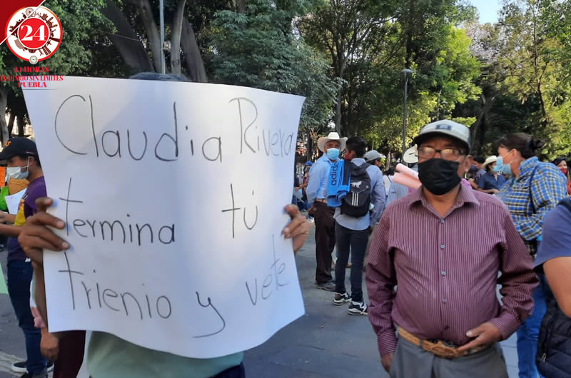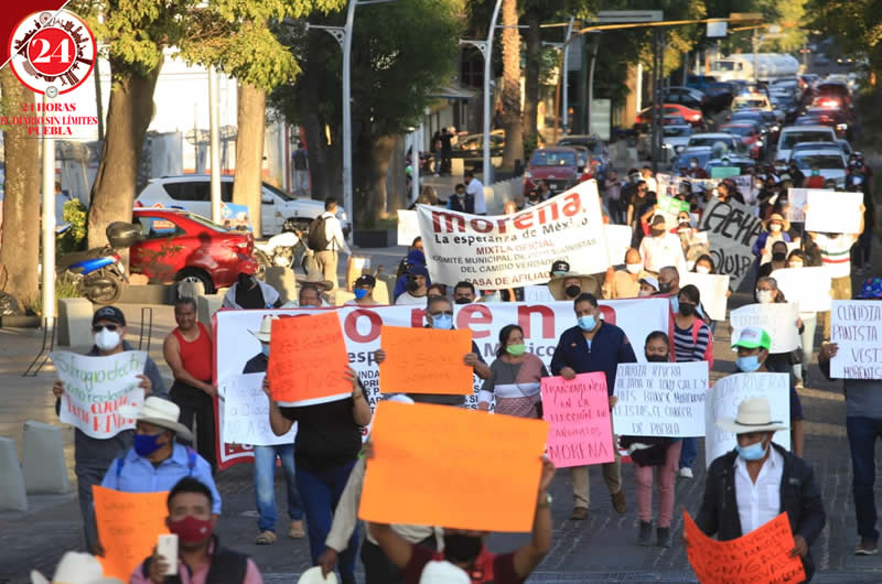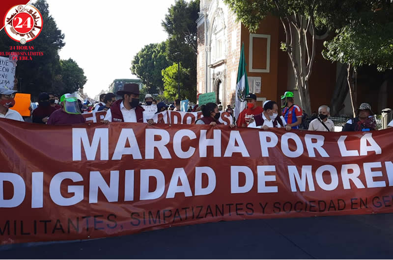 Integrantes o representantes del Movimiento de Regeneración Nacional marcharon en contra de la imposición de candidaturas en la contienda interna del partido en Puebla.
