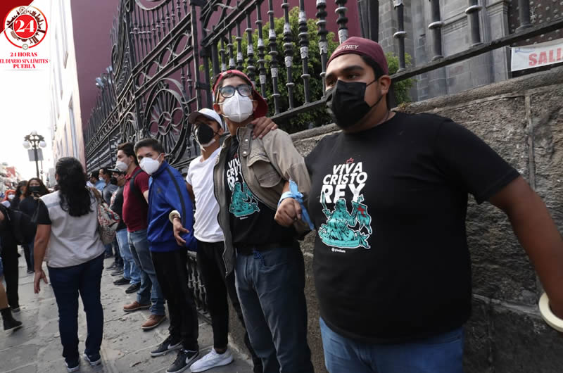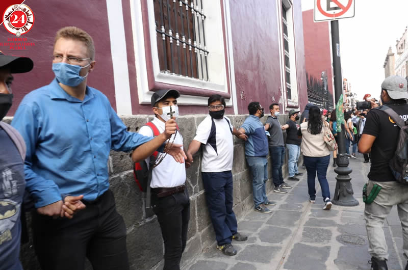 Durante la marcha por el Día Internacional de la Mujer, un grupo de católicos, entre los que había mujeres, así como trabajadores hicieron una cadena humana para proteger la Catedral de Puebla.