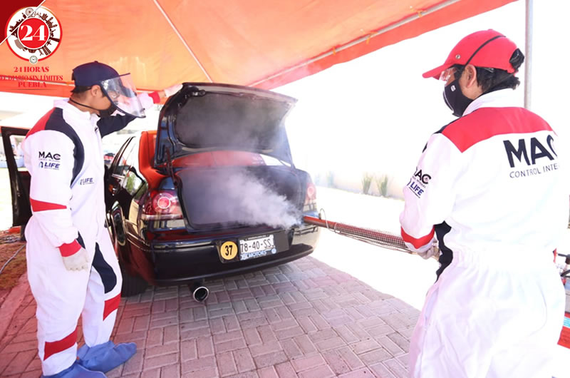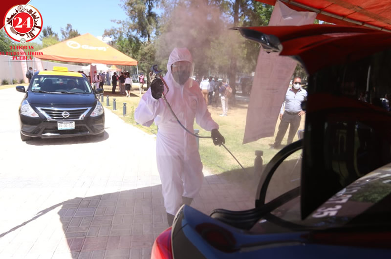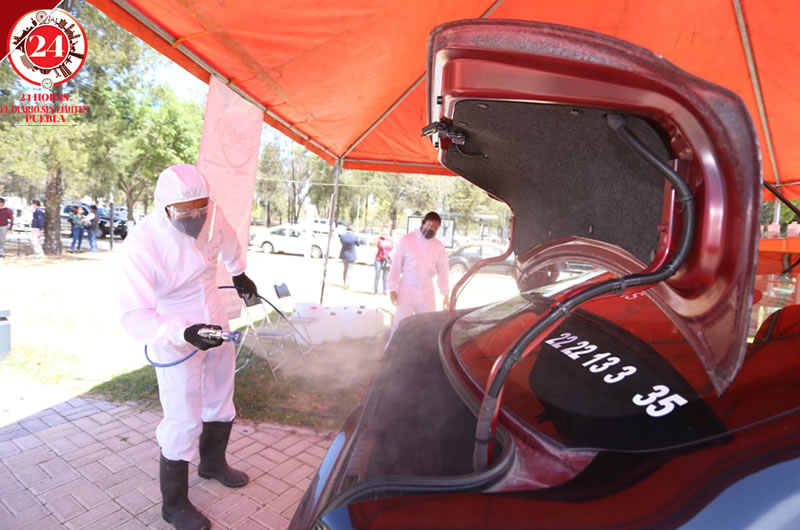 La segunda jornada de sanitización de vehículos particulares y del transporte público se llevó a cabo el martes a un costado de la IBERO Puebla.
