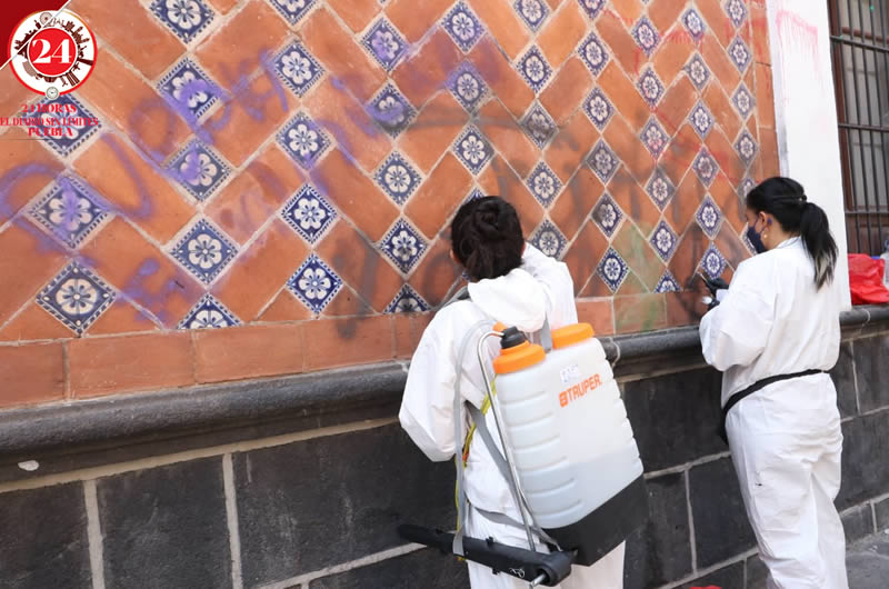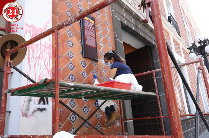 Realizan limpieza afuera de la casa de la Cultura, tras las pintas realizadas durante las manifestaciones del #8M. pic.twitter.com/MJgNUTtCCU