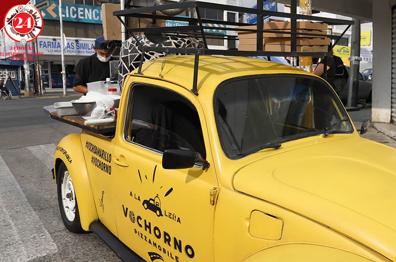 El emprendedor cocina las pizzas al instante en el horno que instaló en un peculiar vocho amarillo, el cual puede mover de un punto a otro y así obtener ingresos.