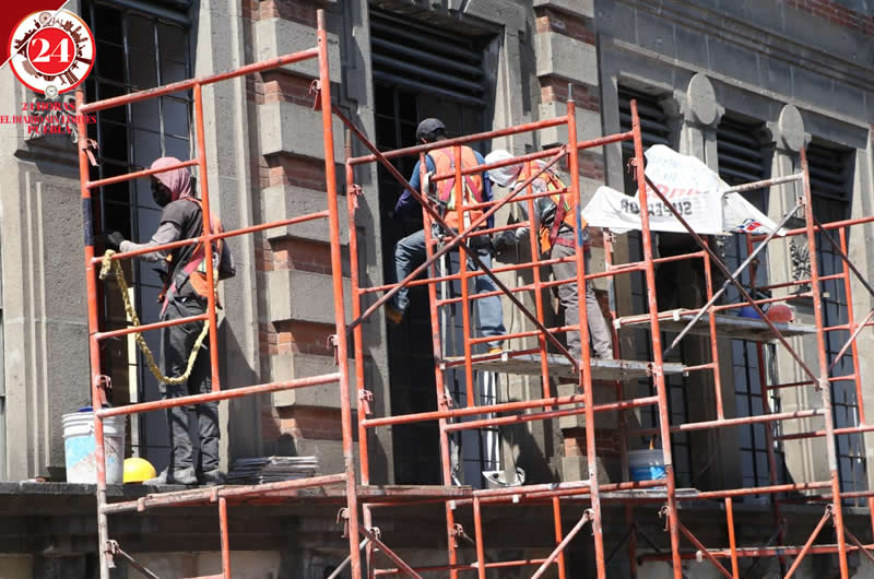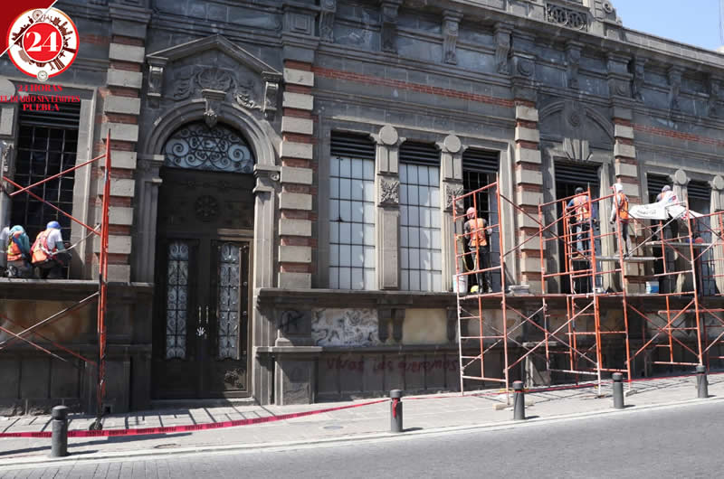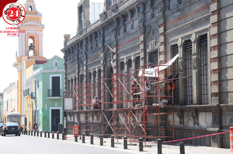 Trabajadores dan mantenimiento a los ventanales del Edificio Carolino, ubicado sobre la avenida Juan de Palafox y Mendoza, en el Centro Histórico.