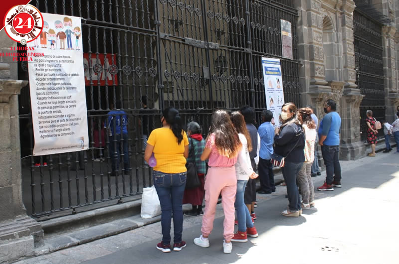 Ante las restricciones por la pandemia de Covid-19 en el estado, los feligreses tuvieron que escuchar misa afuera del templo pues aunque no cerraron las puertas, las rejas de la entrada sí.