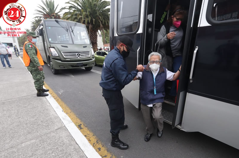 Personas que tenían dificultades para subir o bajar de los autobuses que puso a disposición el Ejercito Mexicano y la Policía Municipal, fueron auxiliadas por los uniformados.