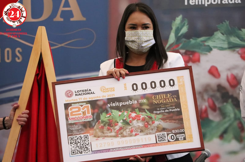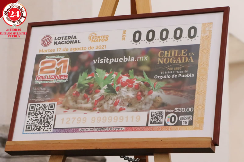La Lotería Nacional y el gobierno estatal celebrarán los 200 años del Chile en Nogada con la distribución de 3 millones 600 mil cachitos que tienen la imagen del tradicional platillo poblano.