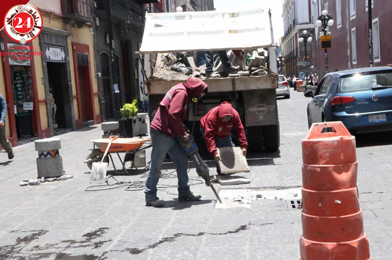 Personal del ayuntamiento de Puebla realizaron trabajos para reemplazar lajas dañadas en el Centro Histórico.