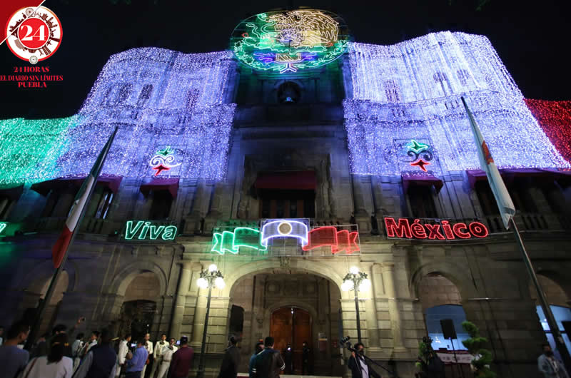 La noche del martes se llevó a cabo el encendido de las luces y adornos en las calles del Centro Histórico de Puebla y en el Palacio Municipal por el mes patrio.