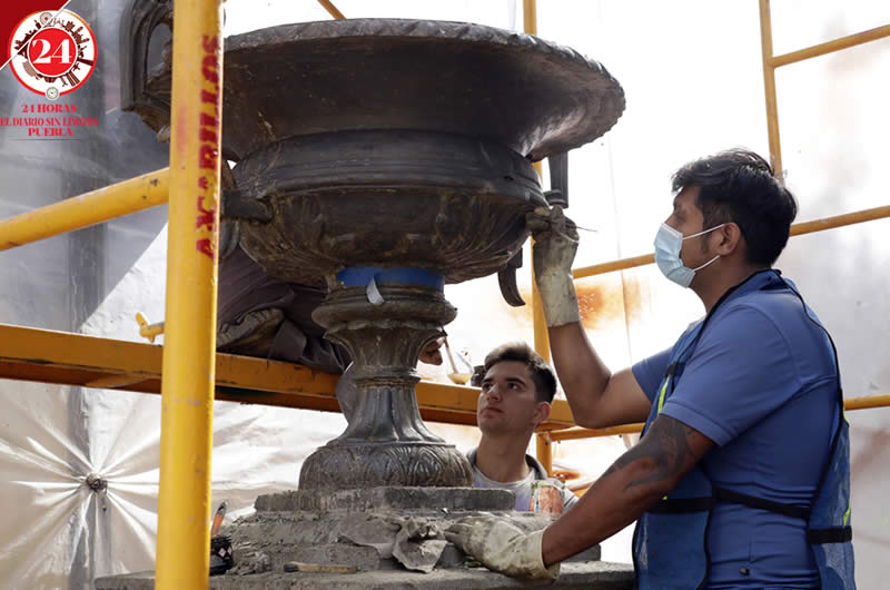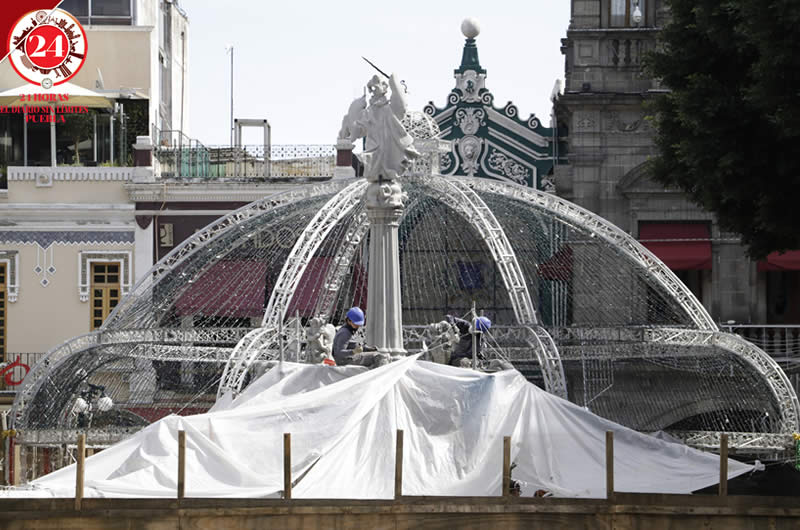 Trabajadores continúan realizando trabajos en el Zócalo de Puebla, días antes del festejo de Grito de Independencia en el Palacio Municipal.