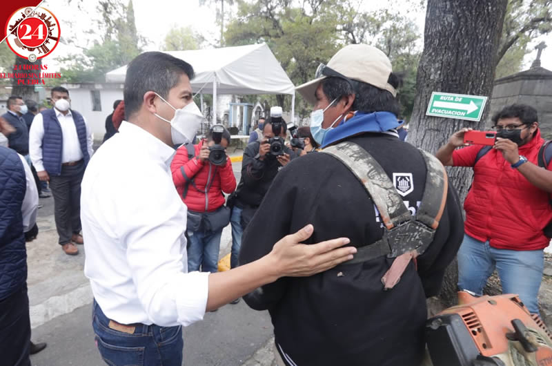 Durante su recorrido por el panteón, Eduardo Rivera saludó al personal que realizaba trabajos de limpieza, a quienes agradeció por su trabajo y los motivó para mantener las áreas en óptimas condiciones durante estas fechas.