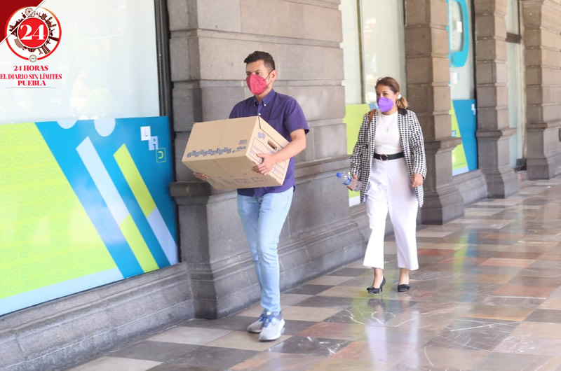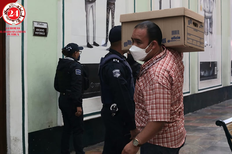 Durante las últimas horas de la gestión de Claudia Rivera en al ayuntamiento Puebla, custodiado por la Policía Municipal, el personal ya realiza la mudanza.