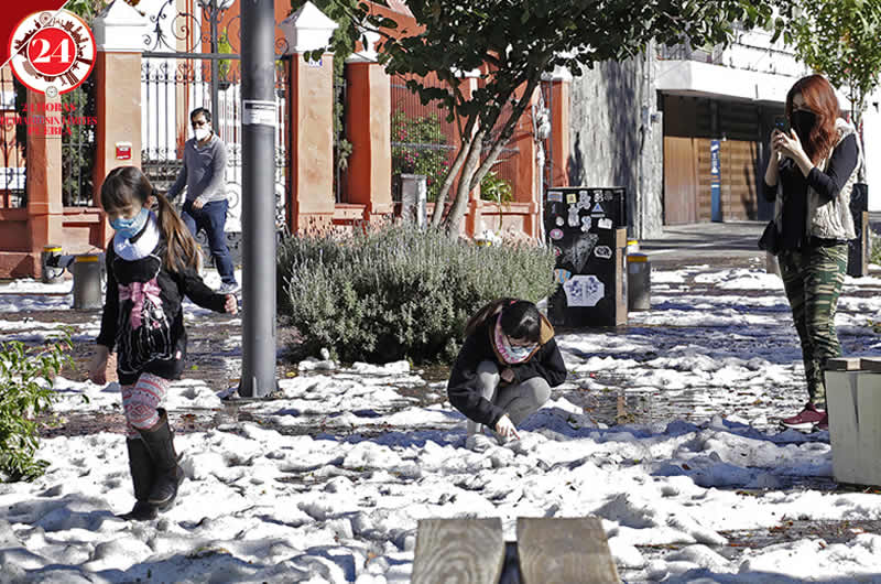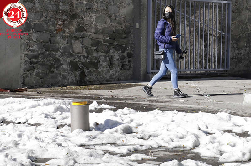 La calle 13 sur a la altura del Paseo Bravo, entre avenida Juárez y 5 poniente, amaneció cubierta de granizo, luego de la fuerte lluvia de la tarde del domingo.