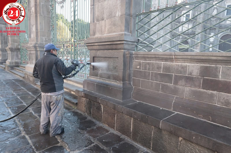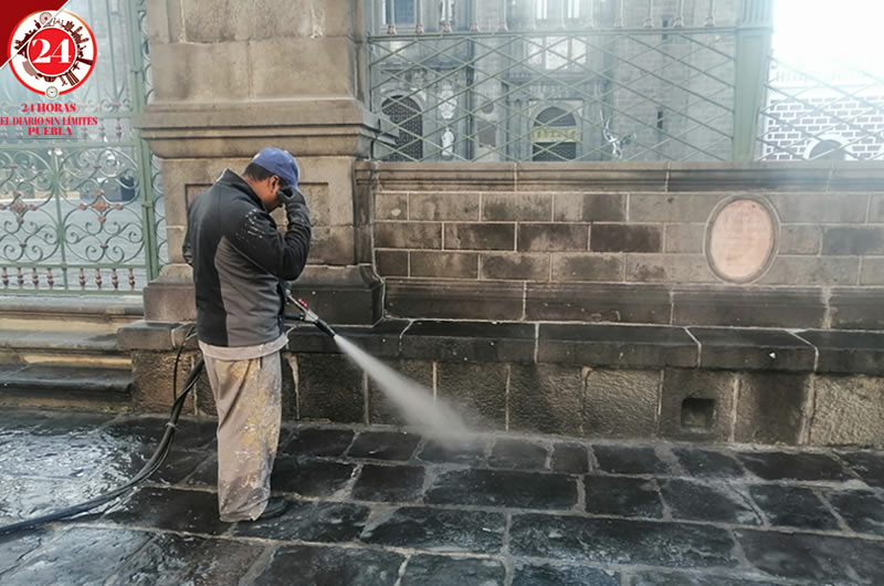 Personal del ayuntamiento de Puebla realizaron labores de limpieza frente a la Catedral, tras la marcha feminista del 25 de noviembre.