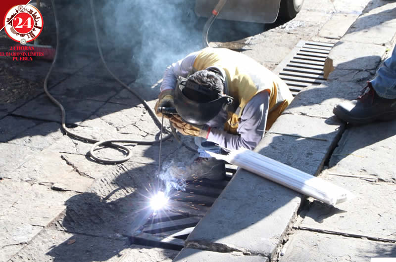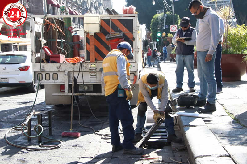 Trabajadores del ayuntamiento de Puebla realizaron limpieza este miércoles en las fachadas de inmuebles ubicados en la avenida Reforma, así como reparaciones en las alcantarillas que rodean al Zócalo.