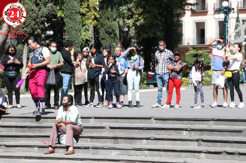 El show de payasitos continúa en la capital y a un costado de la Catedral, los poblanos se reunieron para observarlos y pasar un rato de humor.