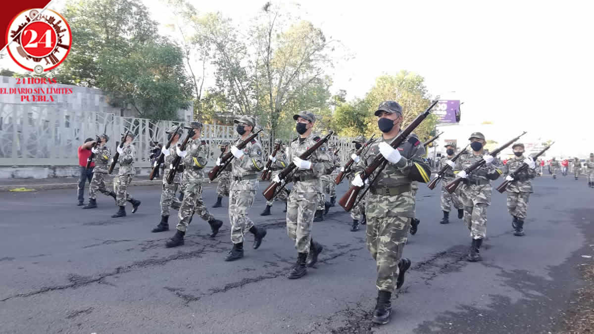 Alumnos que participarán el Desfile del 5 de Mayo en la capital, asistieron al pase de revista y ensayo general en inmediaciones del Parque Ecológico, para alistar los detalles de este importante evento en Puebla.
