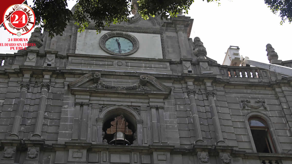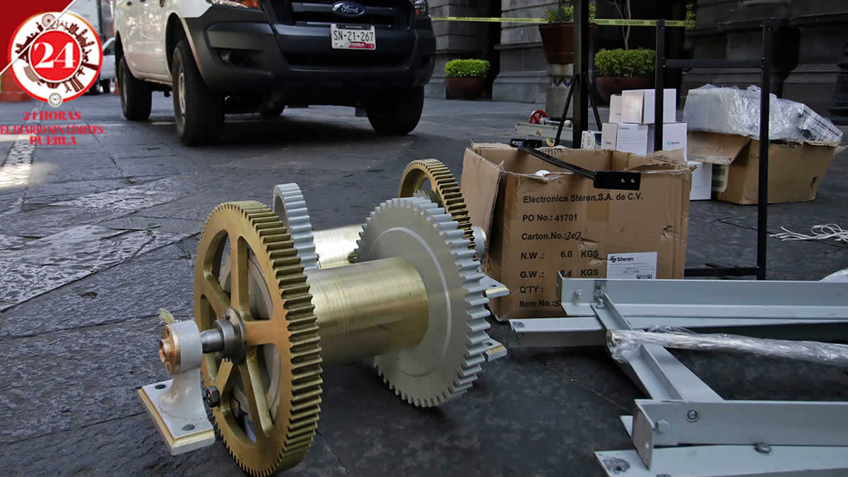 Personal del ayuntamiento de Puebla volvió a instalar el reloj Omega del Palacio Municipal, luego de que fuera retirado para darle mantenimiento.
