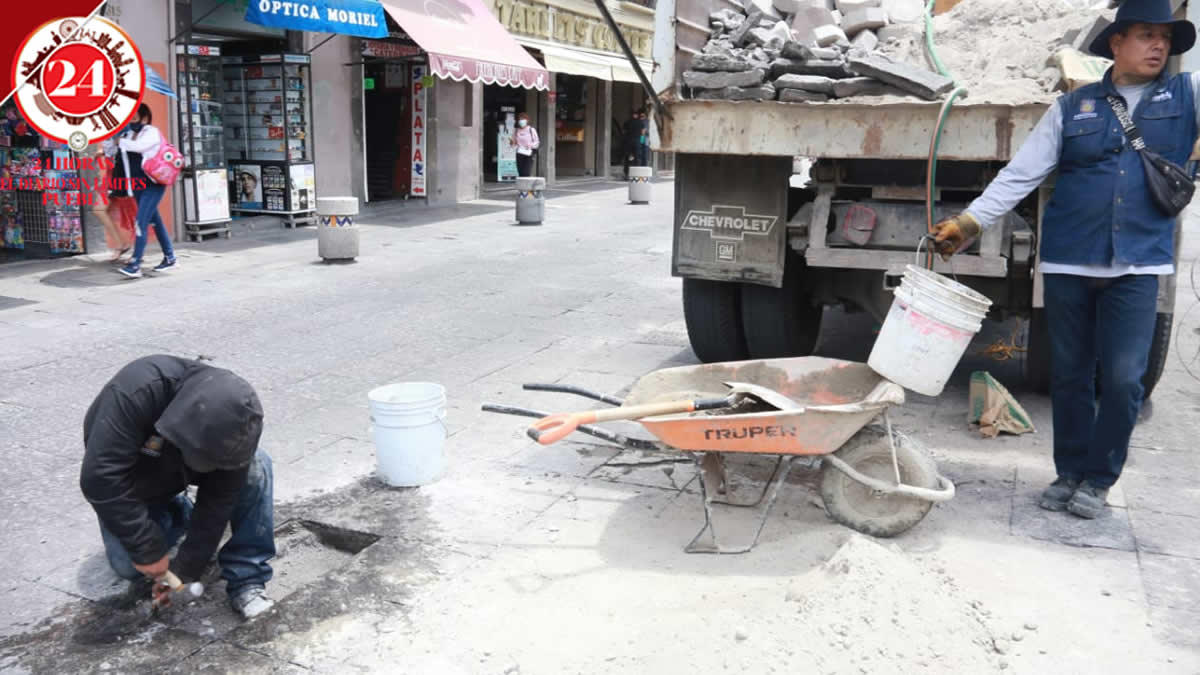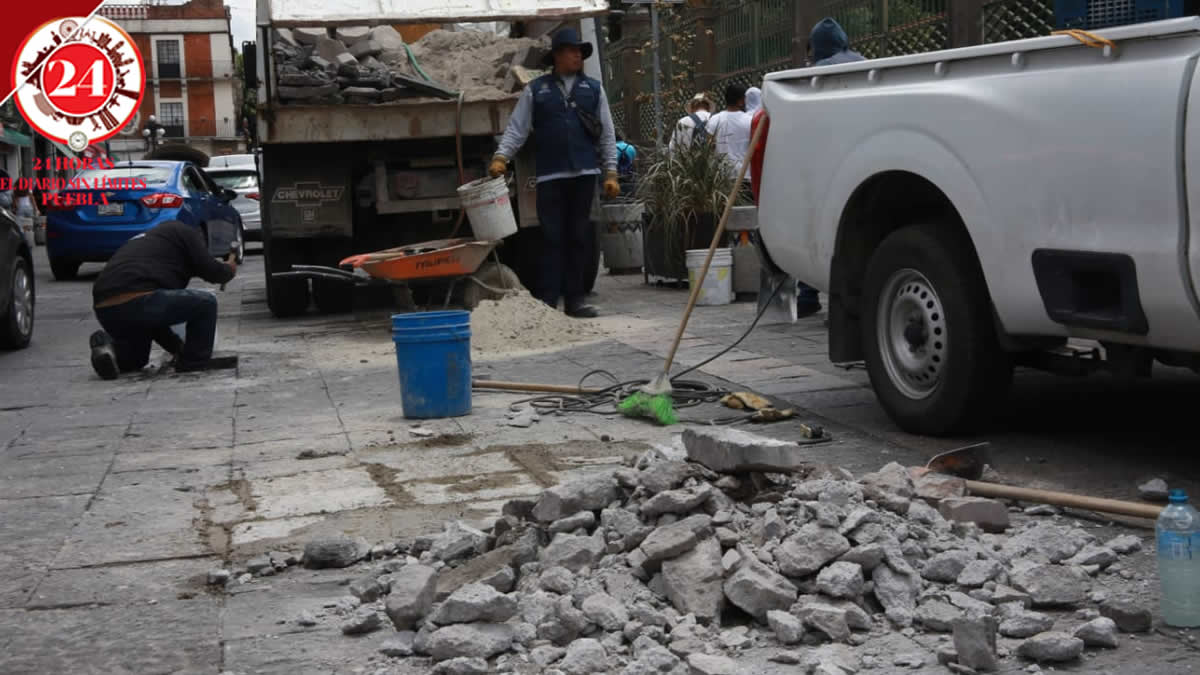 El ayuntamiento de Puebla realizó el cambio de lajas en inmediaciones de la Catedral, entre la 5 poniente y 16 de Septiembre.