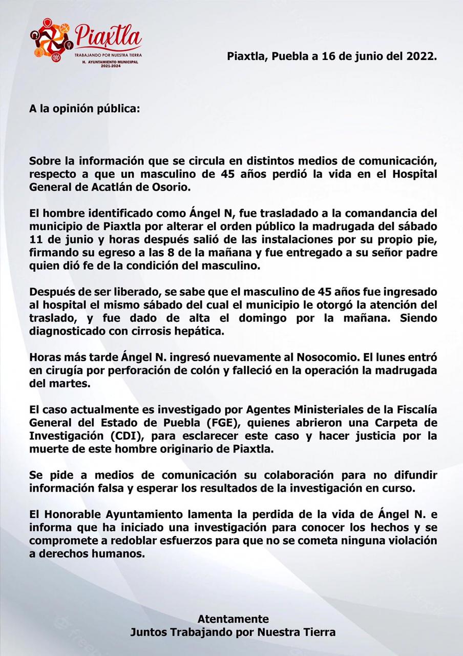 En un comunicado, el Ayuntamiento de Piaxtla rechazó el pasado 16 de junio las acusaciones y aseguró que Tigre Aquino tenía diagnóstico de cirrosis hepática y que “el lunes entró a cirugía por perforación de colon y falleció en la operación la madrugada del martes”.