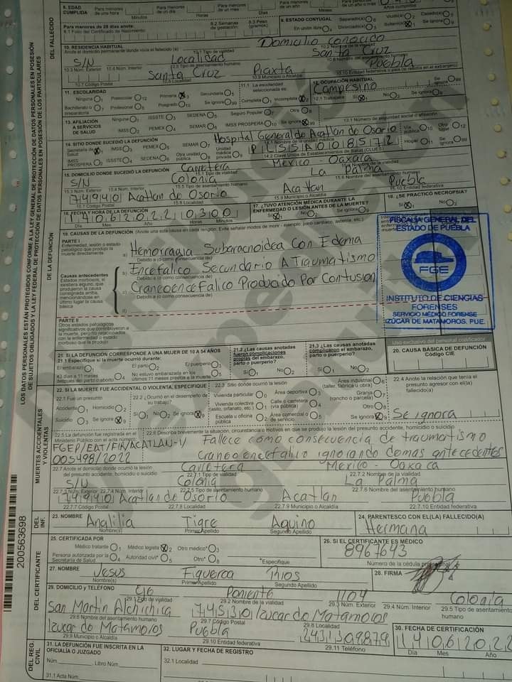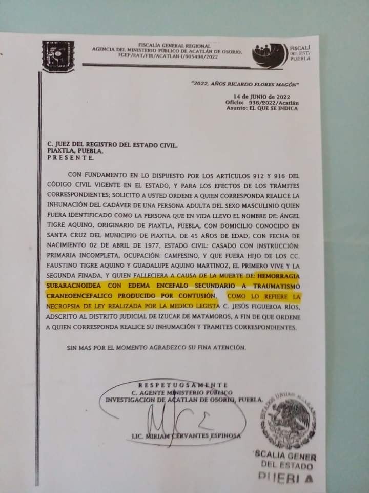 En el oficio 936/2022/Acatlán con fecha del 14 de junio de este año, la agente del Ministerio Público Investigador de Acatlán de Osorio, da cuenta que la causa de la muerte de Tigre Aquino fue “hemorragia subaracnoidea con edema encéfalo secundario a traumatismo craneoencefálico, producido por contusión”.