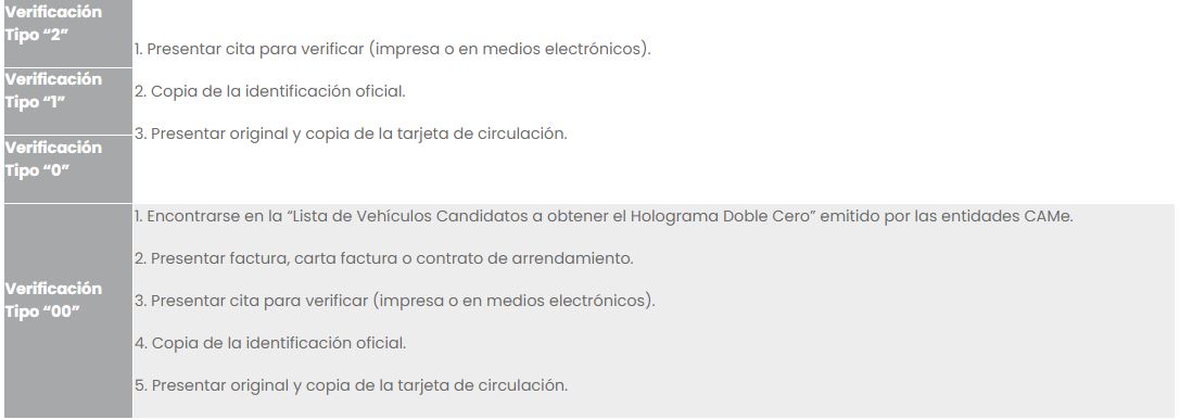 Los requisitos para la verificación de autos tipo 1, 2 y 0 son: