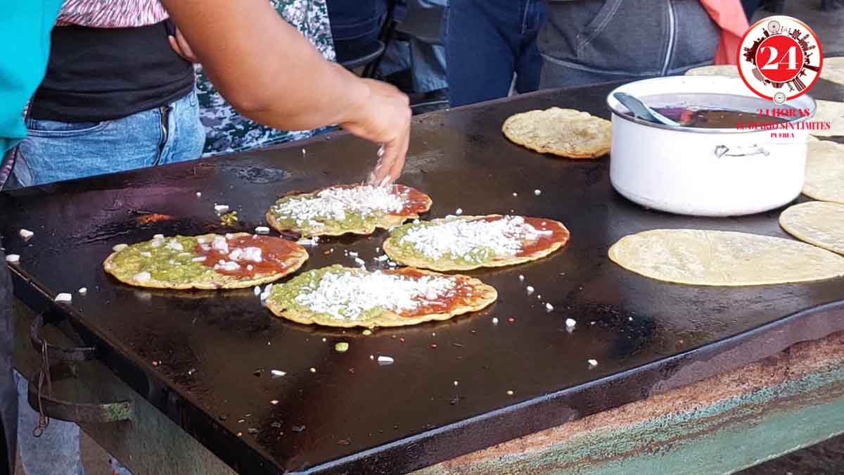 Al llegar al atrio, el olor a masa, salsa, queso y manteca es penetrante y alerta al apetito de quienes llegamos buscando este antojito elaborado con maíz, alimento básico de todos los mexicanos.