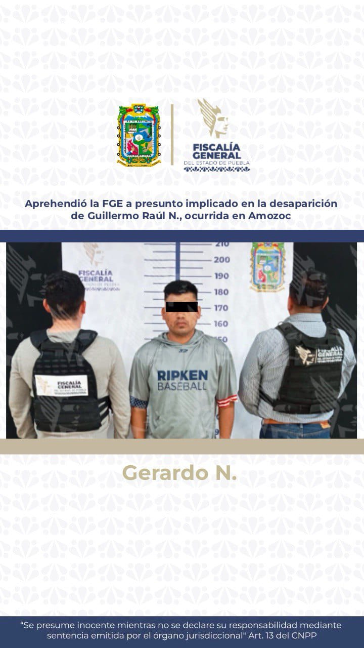 La Fiscalía General del Estado (FGE) de Puebla confirmó la aprehensión de Gerardo N., segundo implicado en la desaparición y homicidio de Guillermo Raúl, joven de 23 años. El ahora detenido habría seguido a la víctima tras una venta fallida de laptop.