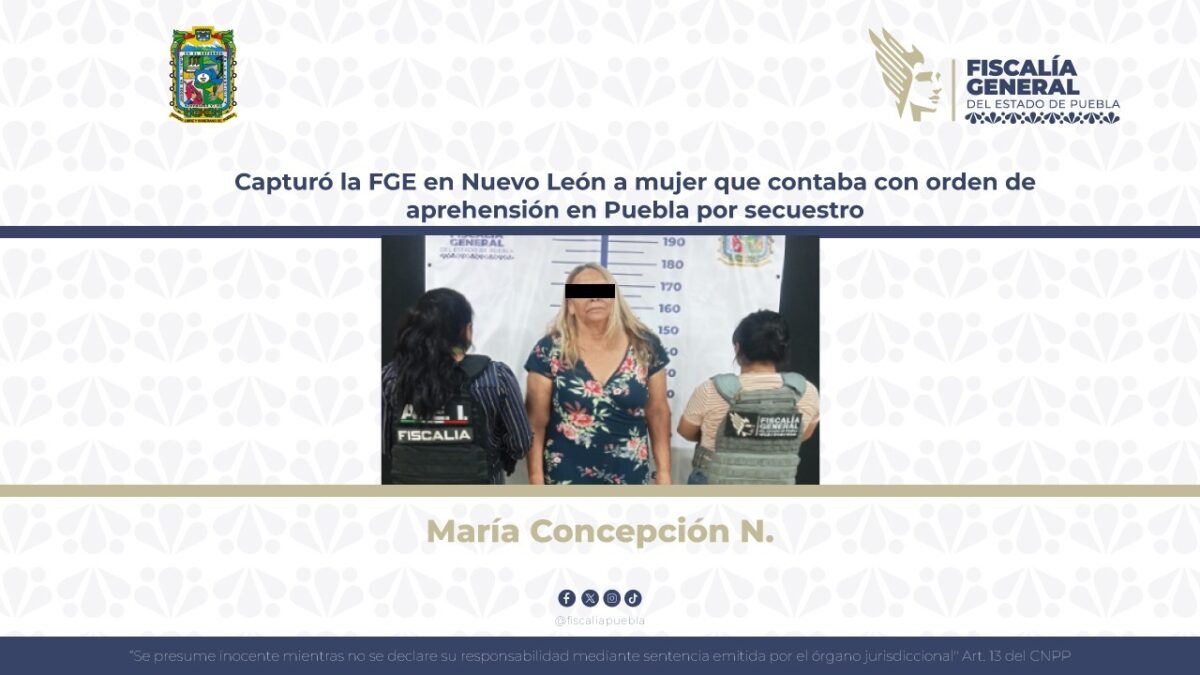 La Fiscalía General del Estado de Puebla informó la detención de María Concepción N. en Nuevo León, por su presunta participación en un secuestro agravado ocurrido en 2017.