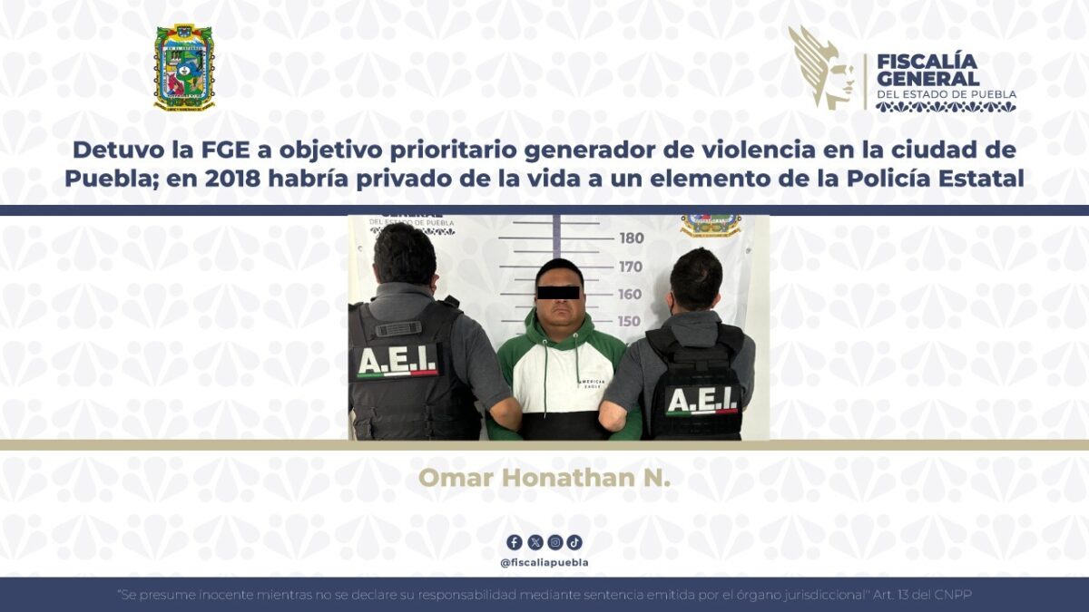 La Fiscalía General del Estado (FGE) logró la detención de Omar Honathan N., alias “El Negro”, considerado objetivo prioritario y presunto generador de violencia en Puebla capital.