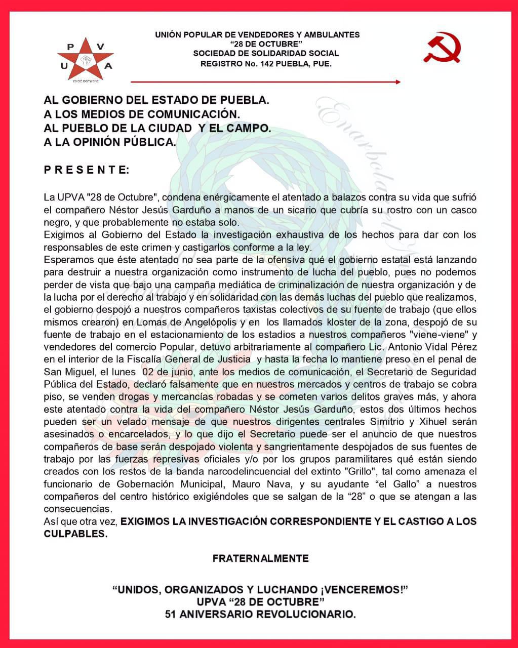 La agrupación 28 de Octubre, reconocida por su lucha histórica en defensa del comercio popular y los derechos sociales en Puebla, manifestó su indignación por el asesinato de uno de sus principales coordinadores y llamó a las autoridades a esclarecer los hechos.
