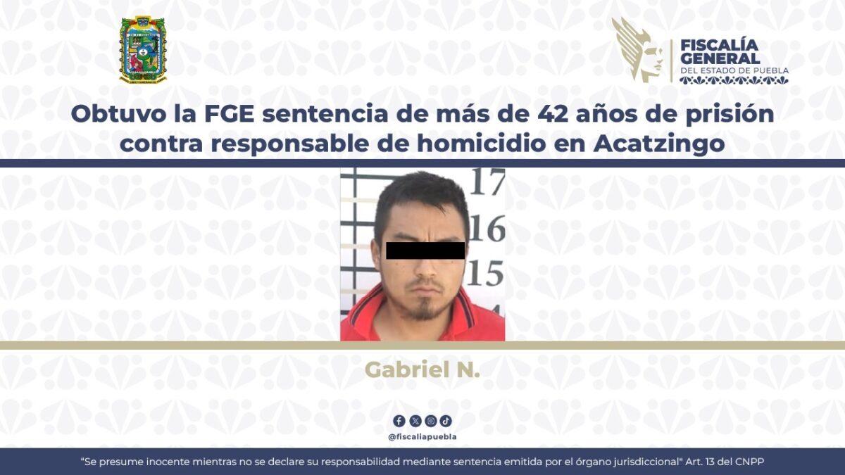 La Fiscalía General del Estado de Puebla obtuvo una sentencia de 42 años y 6 meses de prisión contra Gabriel N., alias “El Tacuaro”, por el delito de homicidio calificado cometido en marzo de 2021 en el municipio de Acatzingo.