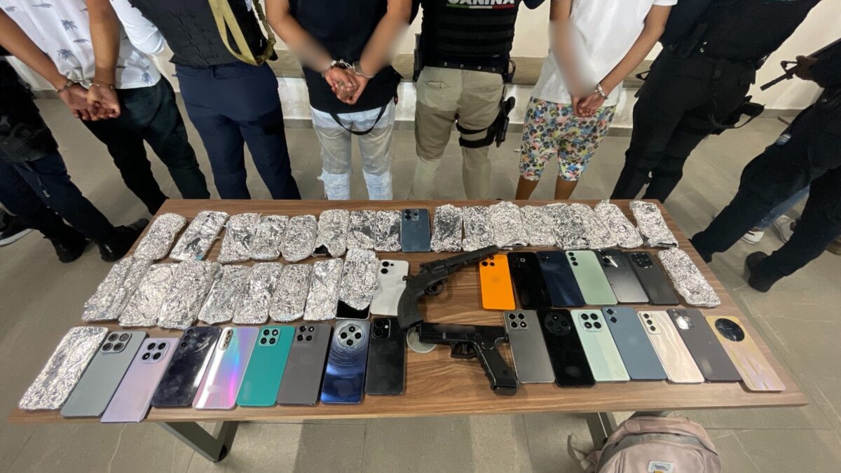 Al momento de la detención, se les encontraron más de cuarenta teléfonos celulares, algunos envueltos en papel aluminio, dos motocicletas, un casco y objetos similares a armas de fuego.