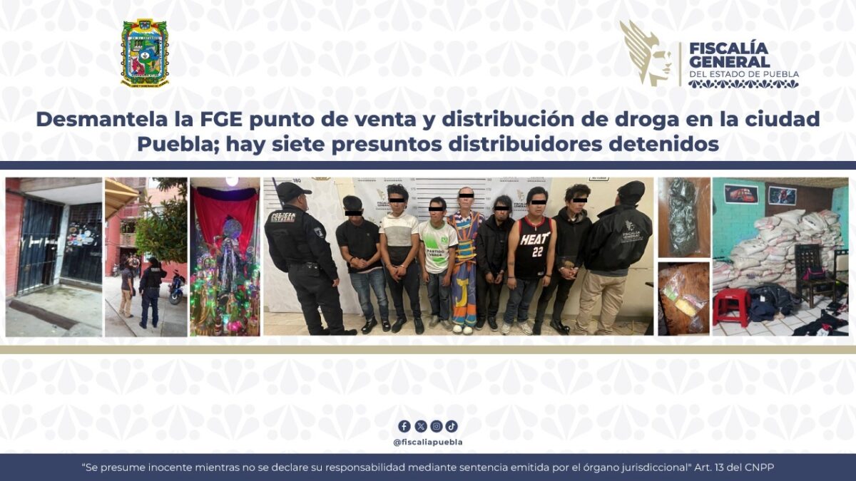 La Fiscalía General del Estado (FGE) desmanteló un punto de venta y distribución de droga en la Unidad Habitacional San Bartolo, en la ciudad de Puebla. Siete personas fueron detenidas.